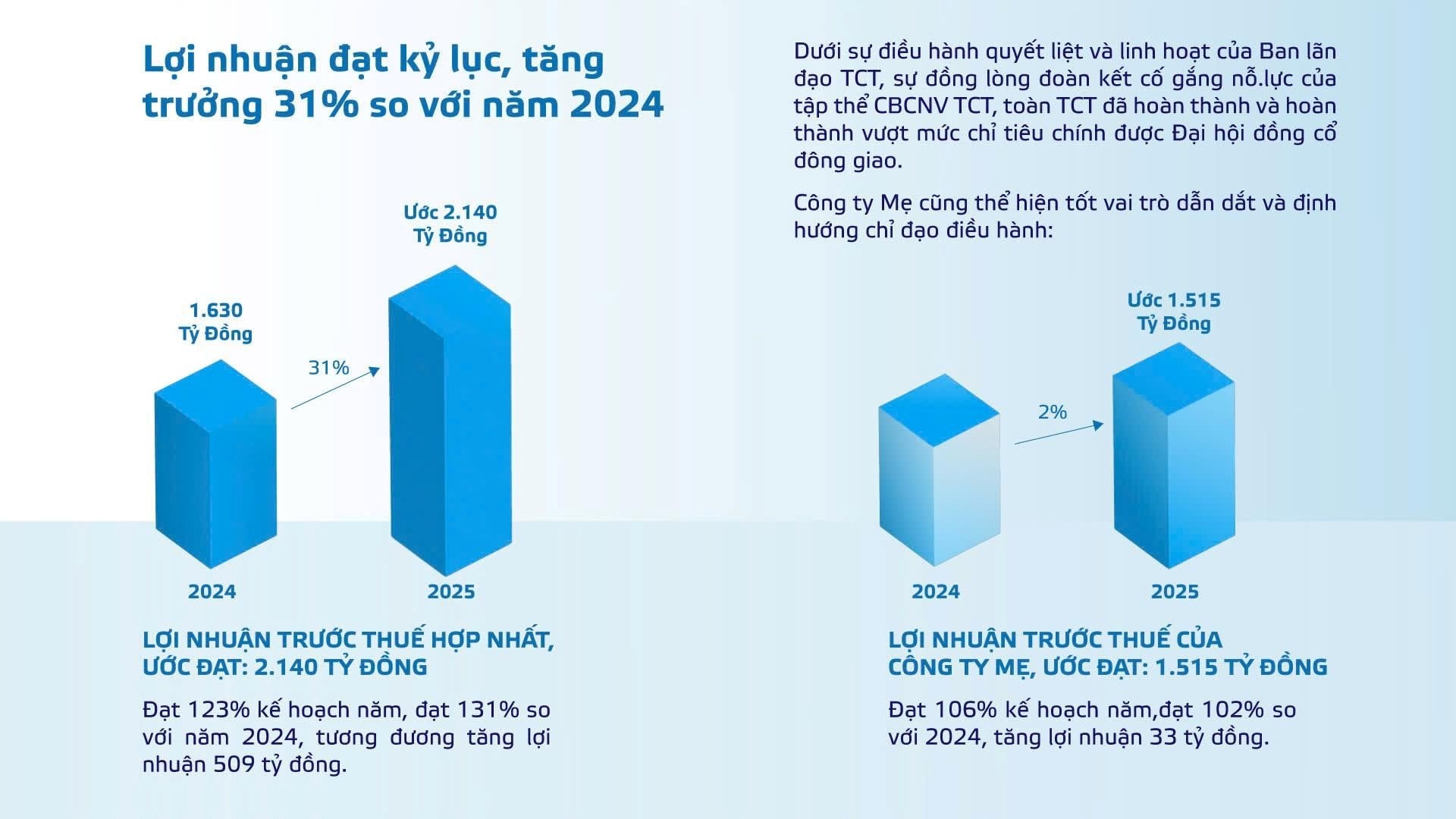 Bước sang năm 2026, doanh nghiệp đặt mục tiêu doanh thu hợp nhất đạt 15.300 tỷ đồng. Lợi nhuận trước thuế hợp nhất dự kiến đạt 1.820 tỷ đồng, trong khi lợi nhuận trước thuế công ty mẹ ước khoảng 1.200 tỷ đồng.