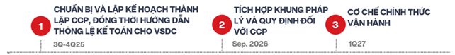 Trong khi mô hình giao dịch không yêu cầu ứng trước tiền (Non-Prefunding – NPF) được xem là giải pháp tạm thời nhằm đáp ứng tiêu chí nâng hạng của FTSE Russell, thì việc xây dựng hệ thống CCP lại là giải pháp mang tính lâu dài và bền vững hơn. Theo lộ trình của Chính phủ, Việt Nam sẽ thành lập công ty con phụ trách CCP trực thuộc Tổng Công ty Lưu ký và Bù trừ Chứng khoán Việt Nam (VSDC), phù hợp với tiêu chuẩn của MSCI. Dự kiến, khung pháp lý và thể chế cần thiết sẽ được hoàn thiện vào cuối năm 2026, và hệ thống CCP sẽ chính thức đi vào hoạt động trong quý 1/2027.