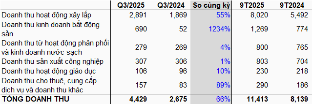 Ngoài khoản lãi đột biến từ thương vụ chuyển nhượng cổ phần, kết quả các hoạt động cốt lõi của Vinaconex trong quý 3 cũng khởi sắc so với cùng kỳ, với tổng doanh thu đạt 4.43 ngàn tỷ đồng, tăng 66%. Các mảng xây lắp và bất động sản là động lực tăng trưởng.