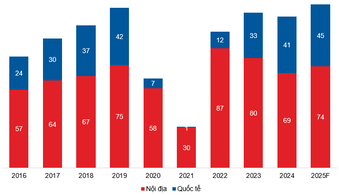 Động lực tăng trưởng chính đến từ sự phục hồi mạnh mẽ của hoạt động du lịch, đặc biệt là khách quốc tế (tham khảo đồ thị bên dưới) cũng như sự mở rộng đội bay của các hãng hàng không lớn như CTCP Hàng không Vietjet (HOSE: VJC), Tổng Công ty Hàng không Việt Nam – CTCP (HOSE: HVN), Bamboo Airways…