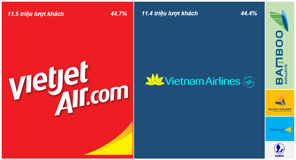 Theo số liệu từ Cục Hàng không Việt Nam (CAAV), Vietjet và Vietnam Airlines đã chiếm gần 90% thị phần khách nội địa, tạo nên một thế “song mã” rõ rệt. Cụ thể, trong 8 tháng đầu năm 2025, Vietjet nắm giữ 44.7% thị phần khách quốc nội, trong khi Vietnam Airlines chiếm 44.4%. Nếu tính cả Pacific Airlines và VASCO, tổng thị phần của Vietnam Airlines Group (*) đạt 48.2%.