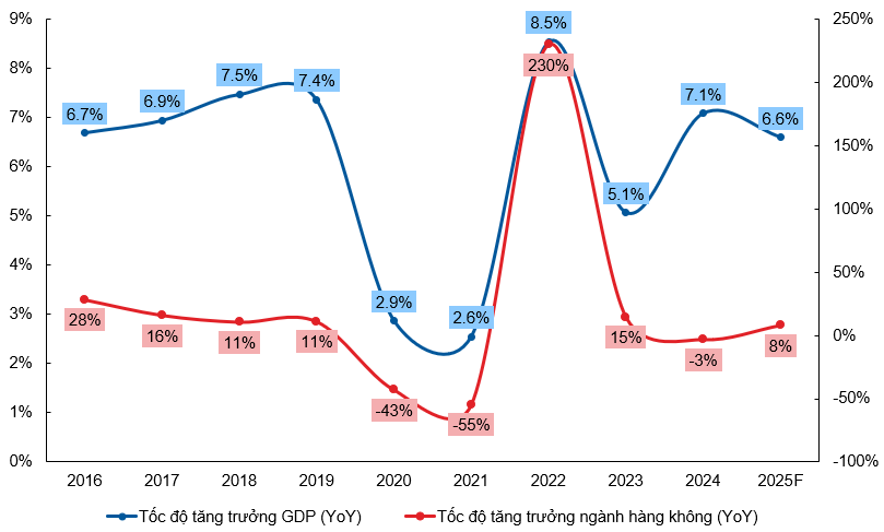 Tốc độ tăng trưởng GDP và ngành hàng không trong giai đoạn 2016-2025F
