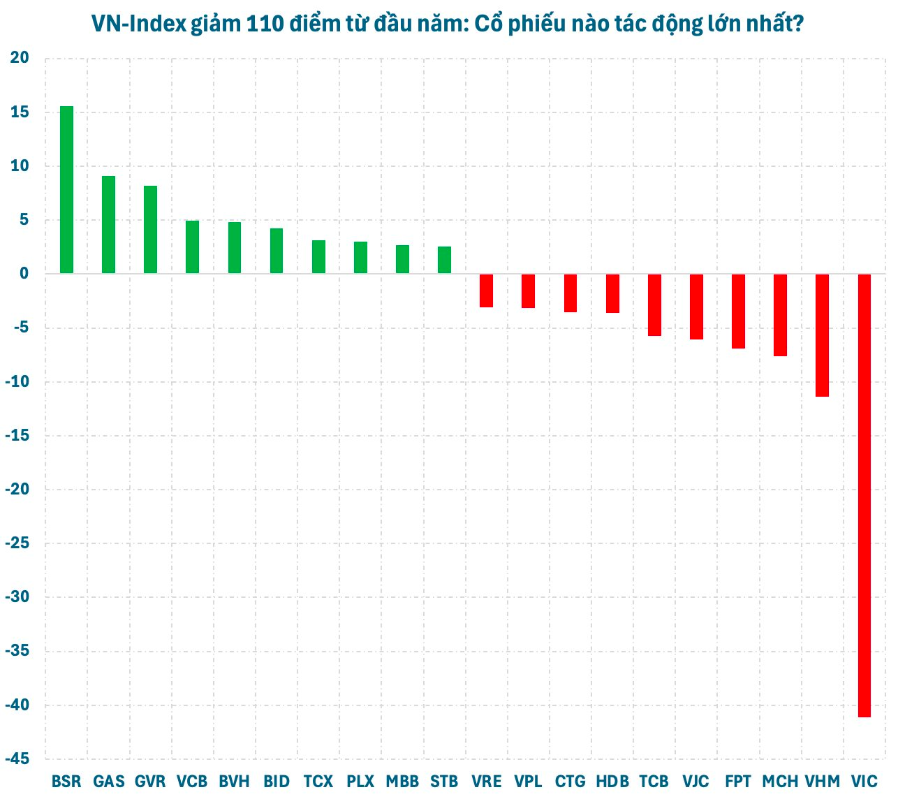 Chiều ngược lại, các cổ phiếu đóng góp lớn vào VN-Index từ đầu năm 2026 chủ yếu là nhóm do Nhà nước chi phối thuộc các ngành như Dầu khí (BSR, GAS, PLX), Ngân hàng – Bảo hiểm (VCB, BID, BVH), Cao su (GVR). Đa phần các cổ phiếu này đều có giai đoạn tăng nóng trước khi đảo chiều điều chỉnh sâu nhưng vẫn cao hơn so với đầu năm.