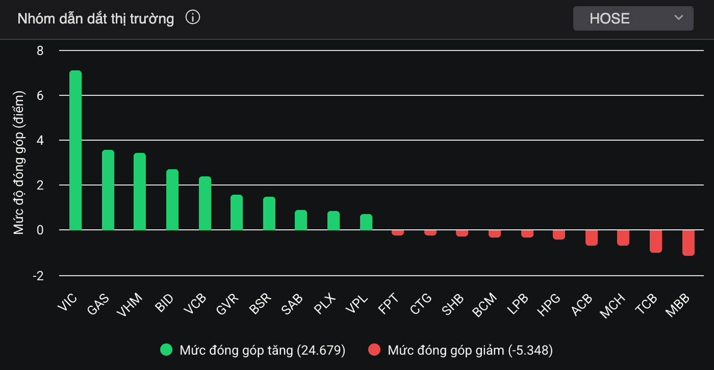Động lực quan trọng nhất của phiên đến từ sự hồi phục rõ nét của nhóm cổ phiếu Vingroup . Sau cú điều chỉnh mạnh ở phiên trước, VIC, VHM và VPL đồng loạt tăng trở lại, trở thành lực kéo lớn giúp VN-Index vượt qua ngưỡng tâm lý 1.900 điểm. Thống kê cho thấy riêng bộ ba cổ phiếu này đã đóng góp hơn 11 điểm vào mức tăng chung của chỉ số.