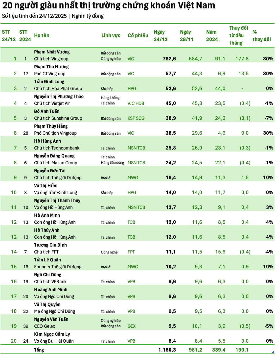 Tính đến ngày 24/12/2025, tổng giá trị tài sản của 20 người giàu nhất thị trường chứng khoán Việt Nam đạt 1,18 triệu tỷ đồng, tăng thêm gần 200.000 tỷ đồng chỉ trong chưa đầy một tháng và tăng 840.900 tỷ đồng so với đầu năm (khoảng 3,5 lần).