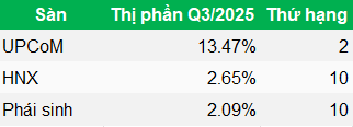 Các số liệu về thị phần môi giới quý 3/2025 cũng cho thấy sự tiến bộ của VPBankS, lần lượt lọt vào top 10 môi giới cổ phiếu trên HNX, UPCoM và top 10 môi giới phái sinh.