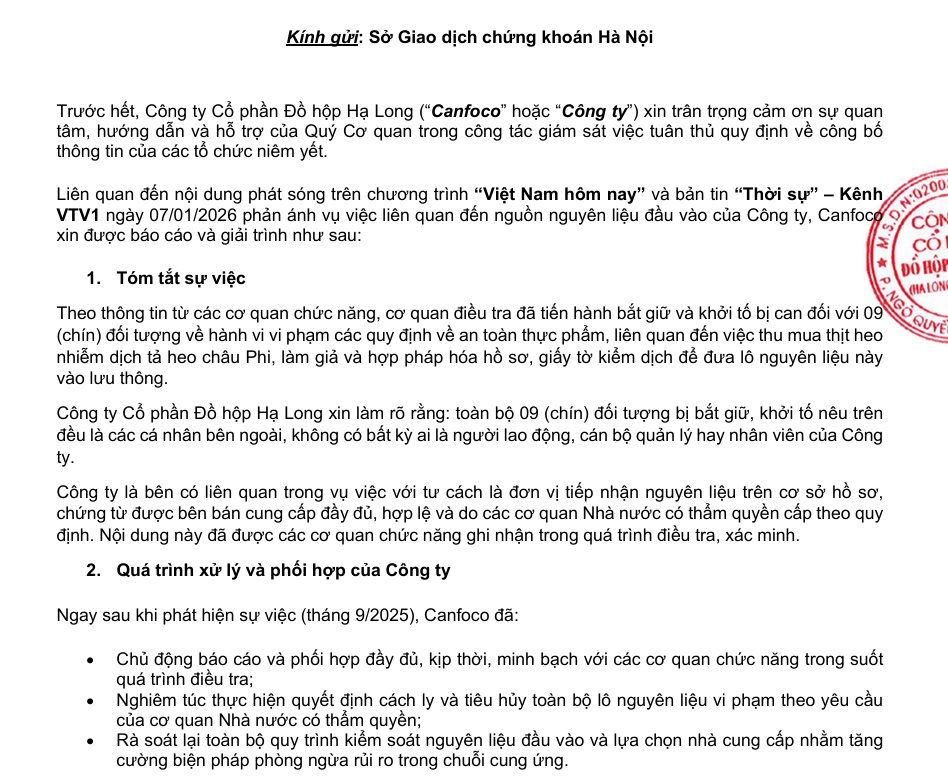 Ngày 8/1/2026, Công ty Cổ phần Đồ hộp Hạ Long (Halong Canfoco – Mã CK: CAN) đã có công văn giải trình gửi Sở Giao dịch Chứng khoán Hà Nội liên quan đến nội dung phát sóng trên bản tin Thời sự – Đài Truyền hình Việt Nam (VTV1) về vụ việc thu mua nguyên liệu thịt lợn nhiễm dịch tả châu Phi.