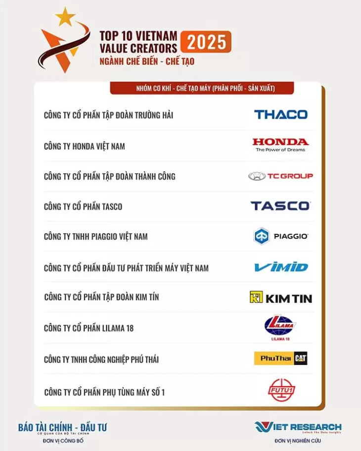 Ngày 27/10/2025, chương trình Nghiên cứu toàn quốc về các Doanh nghiệp tạo giá trị hàng đầu Việt Nam, Viet Research phối hợp cùng Báo Tài chính – Đầu tư (Bộ Tài chính) đã công bố Top 10 Doanh nghiệp tạo giá trị hàng đầu Việt Nam năm 2025 ngành Chế biến – Chế tạo. Tại đây, Công ty Cổ phần Đầu tư Phát triển Máy Việt Nam (VIMID – MCK: VVS) vinh dự được xướng tên trong Top 10 doanh nghiệp dẫn đầu, khẳng định vị thế của thương hiệu cũng như cam kết bền bỉ kiến tạo giá trị cho nền kinh tế và xã hội.